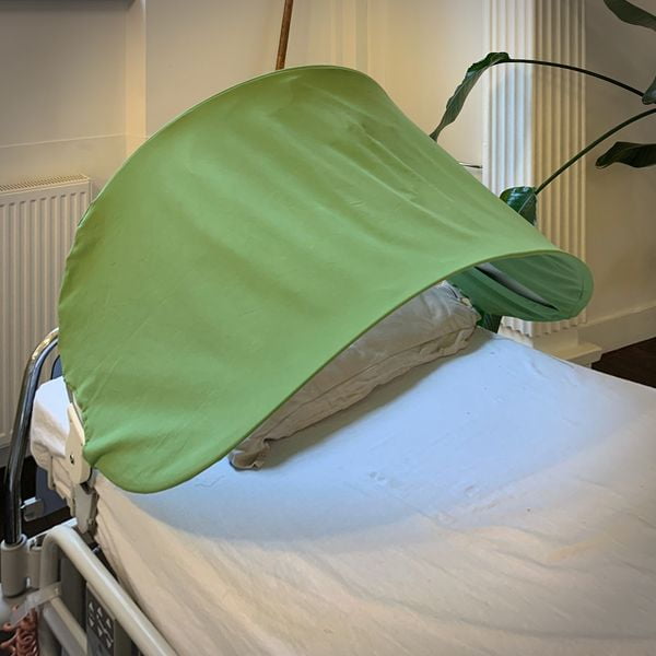 Op een verpleeghuisbed kan de hoodie de bewoner rust en geborgenheid geven.